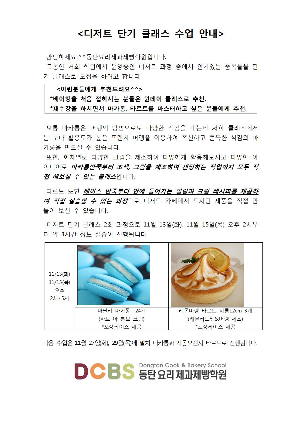 안녕하세요! 동탄요리제과제빵에서 단기 클라스로 디져트 과정을 개강합니다.