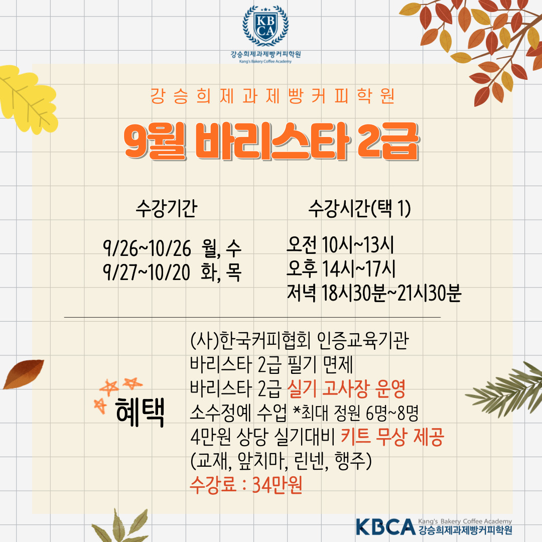 9월 바리스타 2급 자격증반 개강 소식입니다.