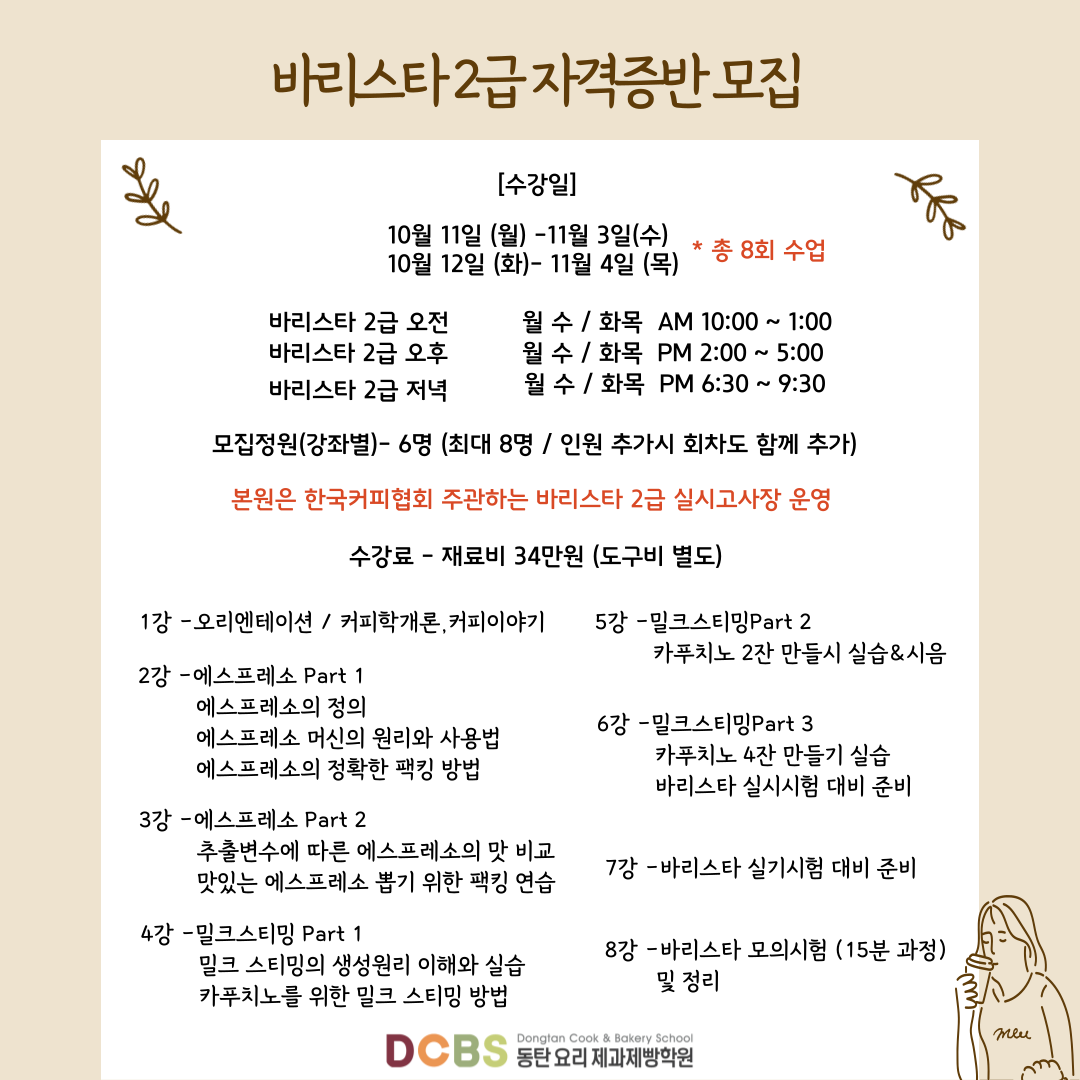 [일반/모집마감] 10월 바리스타 2급 자격증반