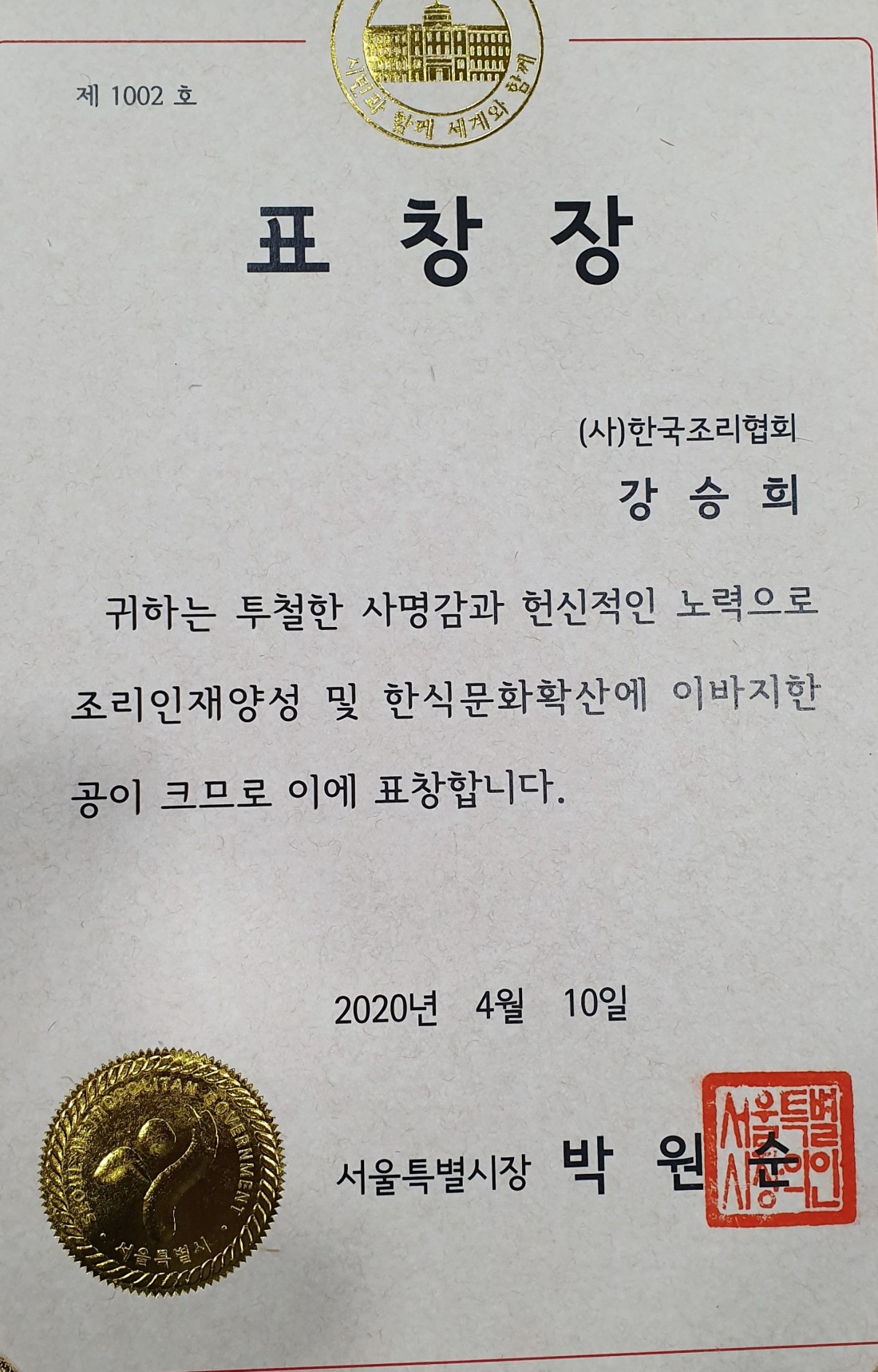 본교 강승희 학교장님이 투철한 사명감과 헌신적인 노력으로 조리인재 양성 및 한식문화 확산에 이바지한 공으로