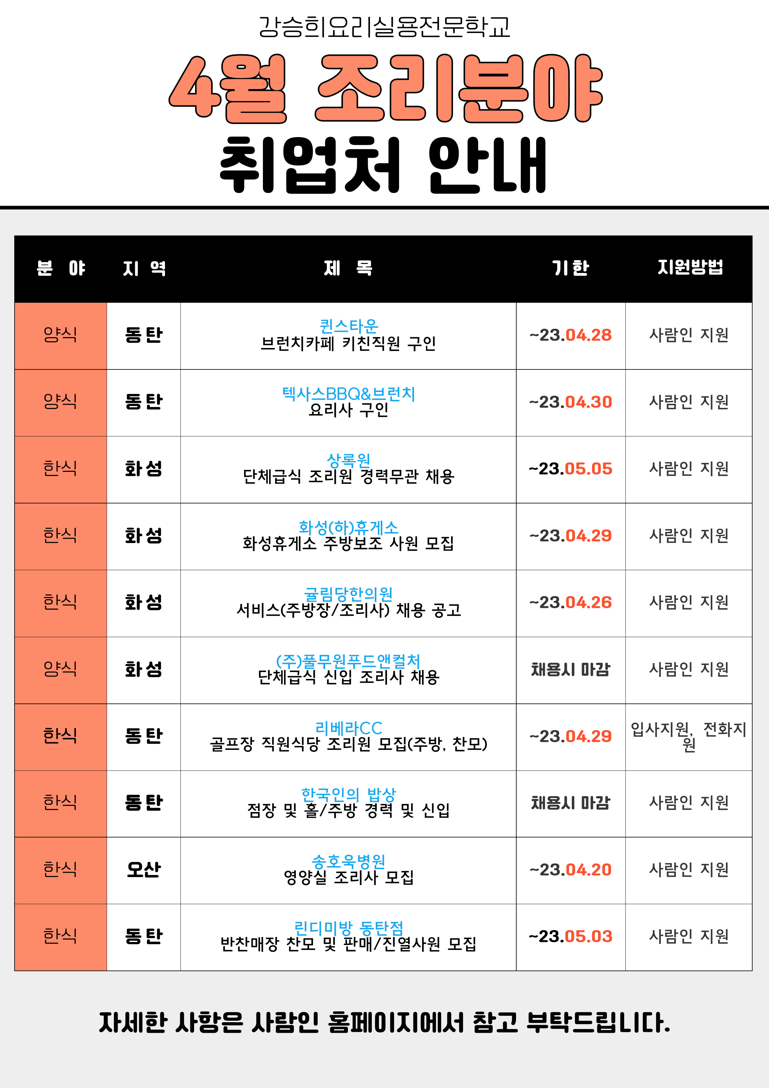 4월 조리분야 / 제과제빵분야 취업처 안내