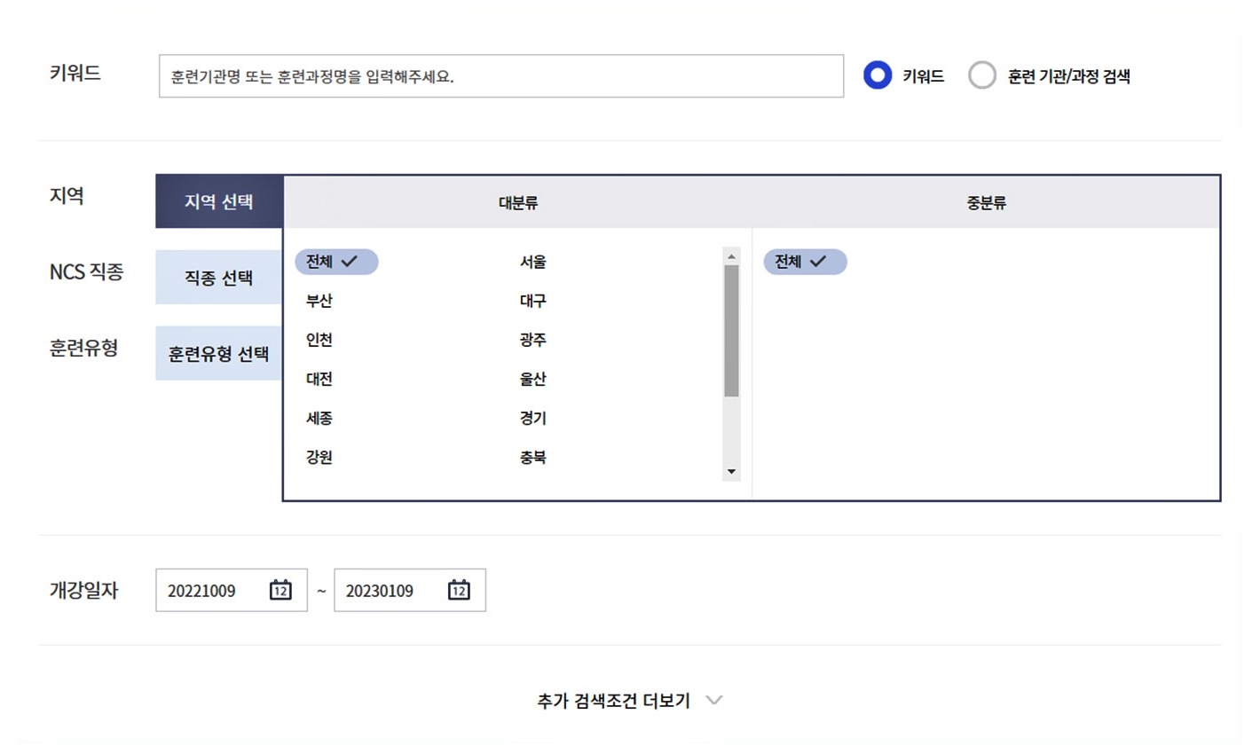 3. 지역별, 직종별, 훈련유형별로 검색이 가능합니다.